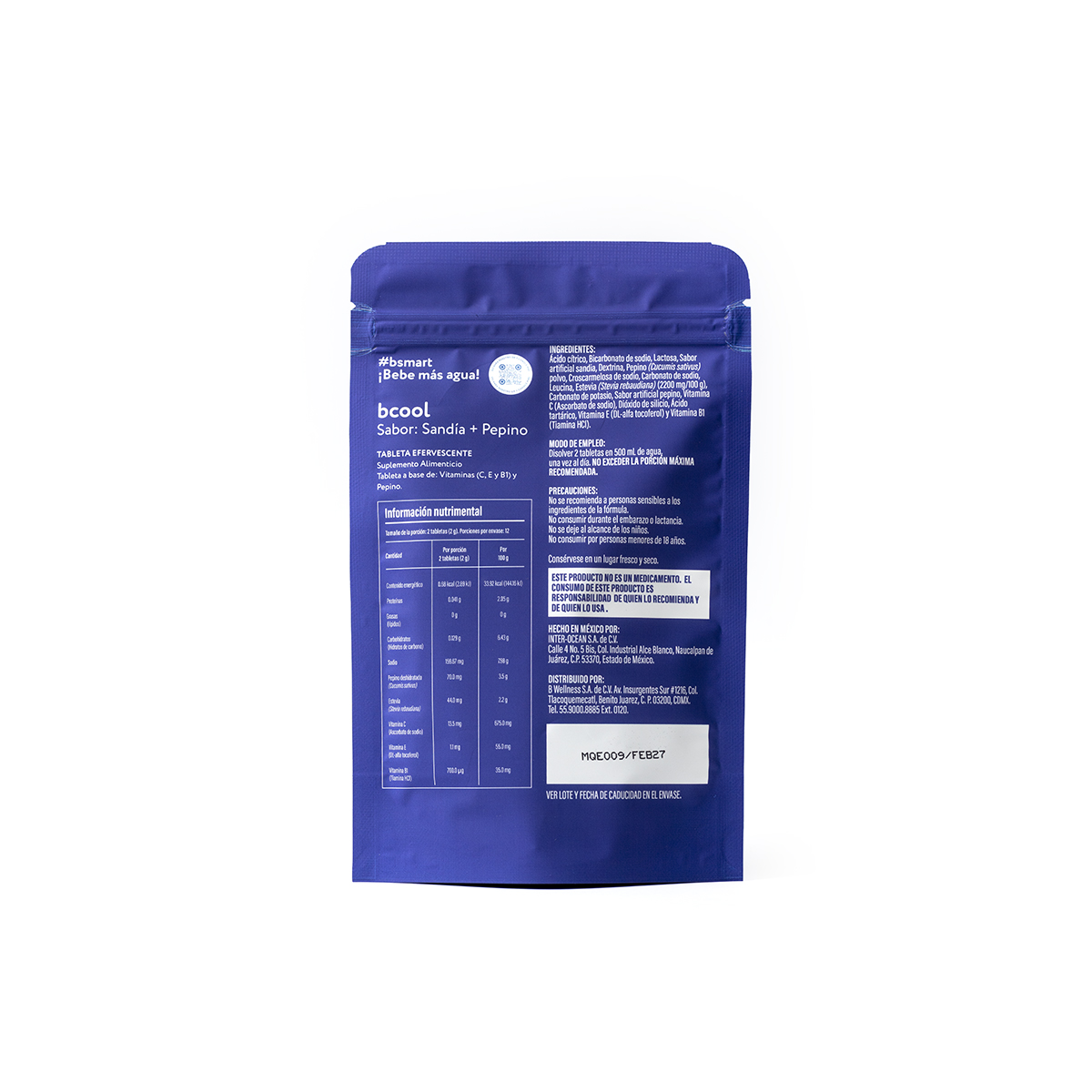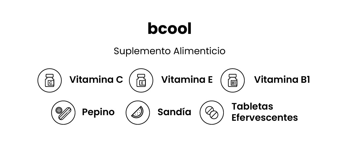 Bcool es una tableta efervescente de uso diario que combina frescura, sabor y beneficios funcionales. Formulada con Vitaminas C, E y B1, además de extracto de pepino, es ideal para quienes buscan mantenerse hidratados, revitalizados y con una sensación de frescura constante a lo largo del día.